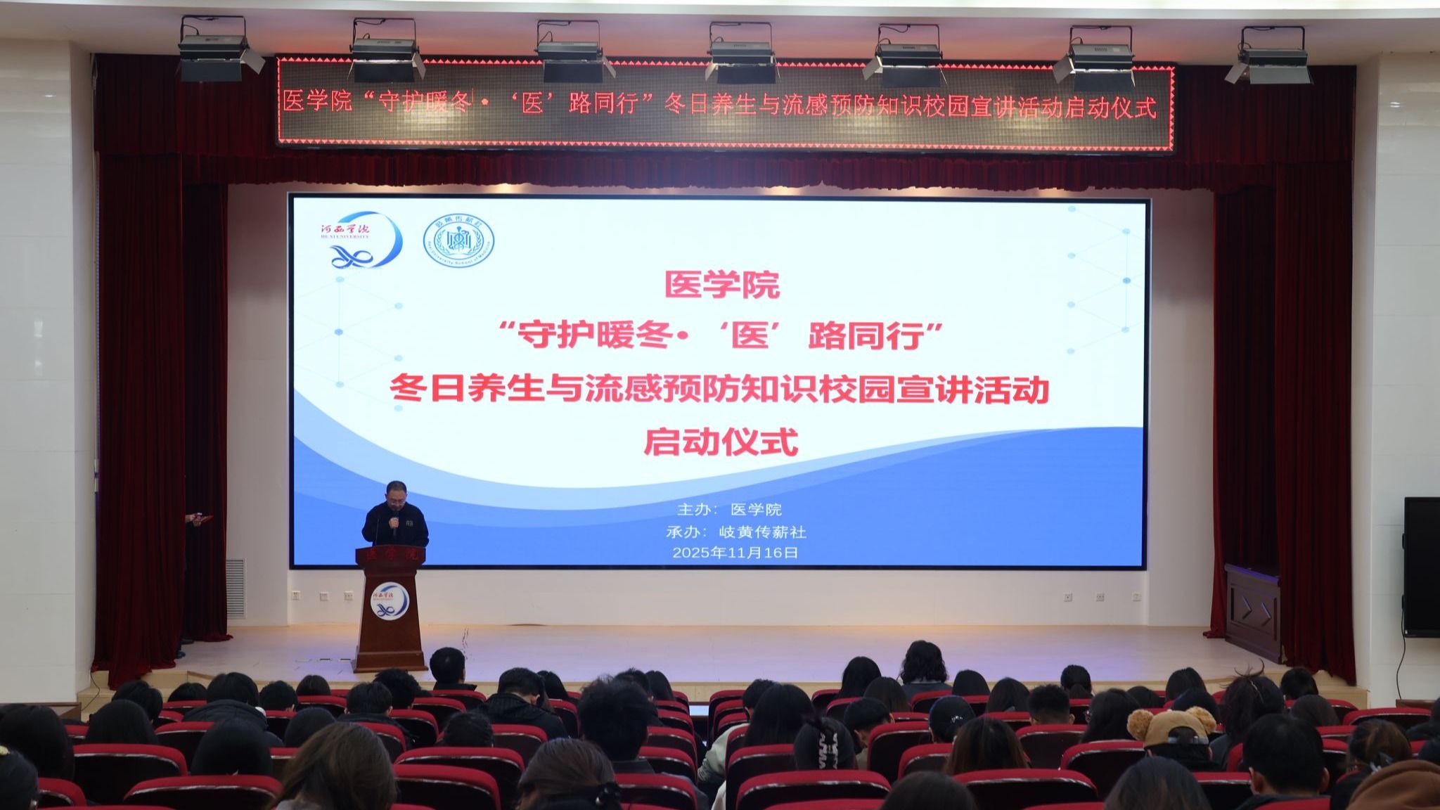 11月16日,由公司主办、岐黄传薪社承办的BV伟德官方网站首届“守护暖冬·‘医’路同行”冬季养生与流感预防知识校园宣讲活动在BV伟德官方网站学术报告厅正式启动。公司负责人、指导老师、辅导员及各员工社团代表等270余人参加了此次活动。
